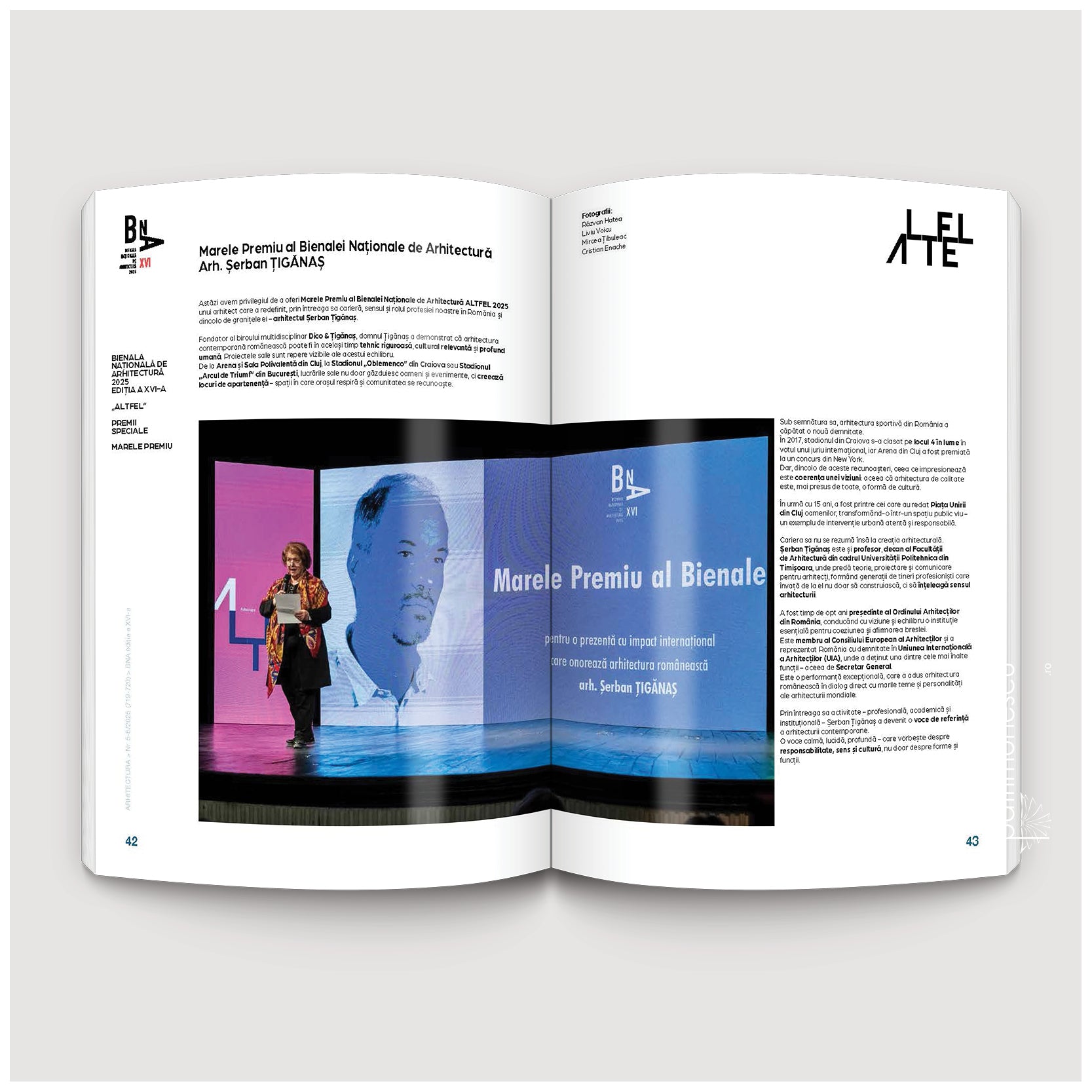 Revista ARHITECTURA nr. 5–6/2025 este numărul special dedicat Bienalei Naționale de Arhitectură 2025, ediția a XVI-a, cu tema „ALTFEL”. Volumul urmărește Bienala ca un jurnal de călătorie prin 9 orașe din țară, de la lansarea de la ARCUB din București până la galele din Constanța, Sibiu, Timișoara, Sighetu Marmației, Târgu Mureș, Târgoviște, Cluj-Napoca și Iași, acolo unde au fost premiate peste 100 de proiecte înscrise în 19 secțiuni.