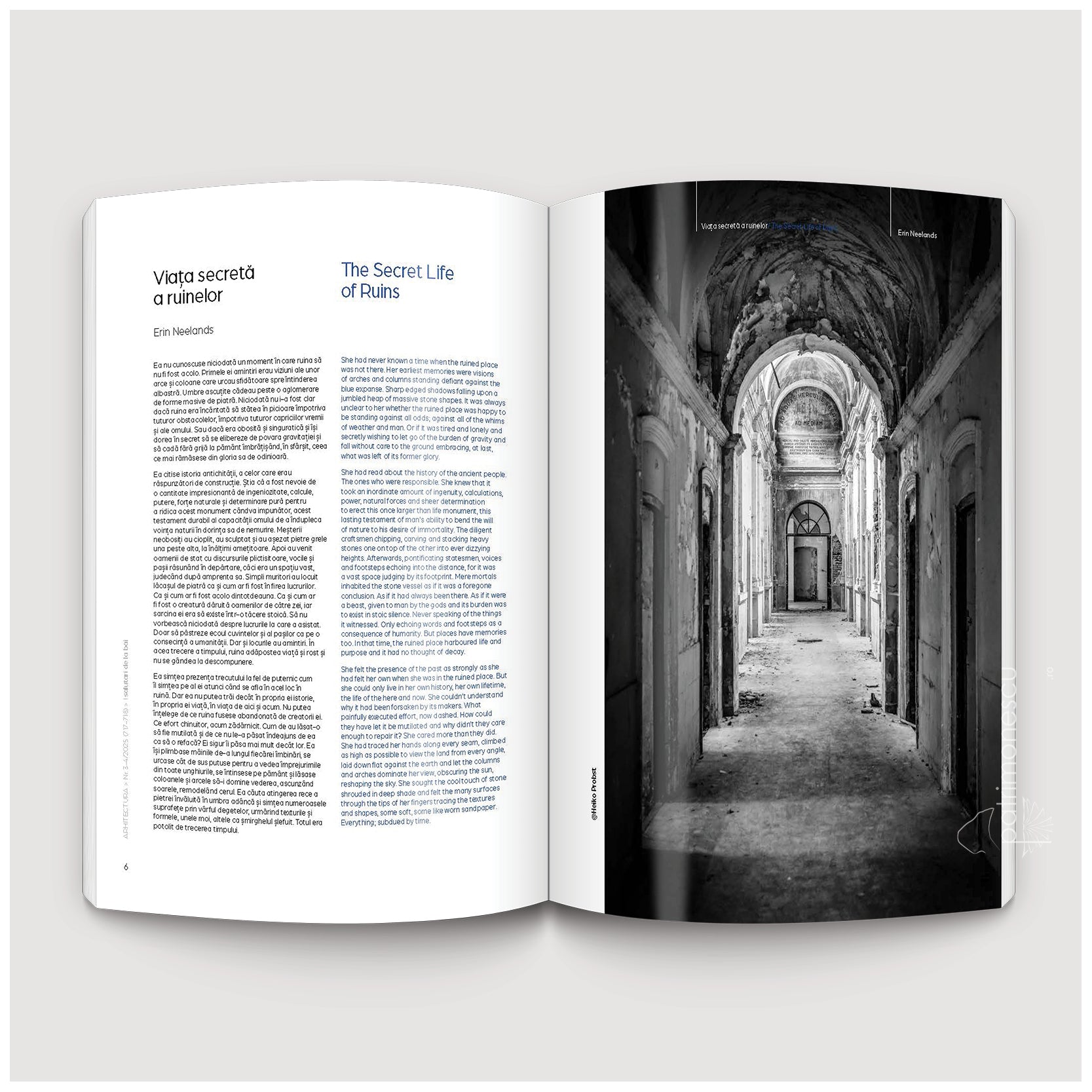 Numărul se deschide cu o contemplație, o ficțiune eseistică ce transformă ruina într-un personaj viu, capabil să ne vorbească despre timp, memorie și reconstrucție interioară. Un text care pune tonul întregii reviste: nu doar informativ, ci și afectiv, meditativ, cultural.