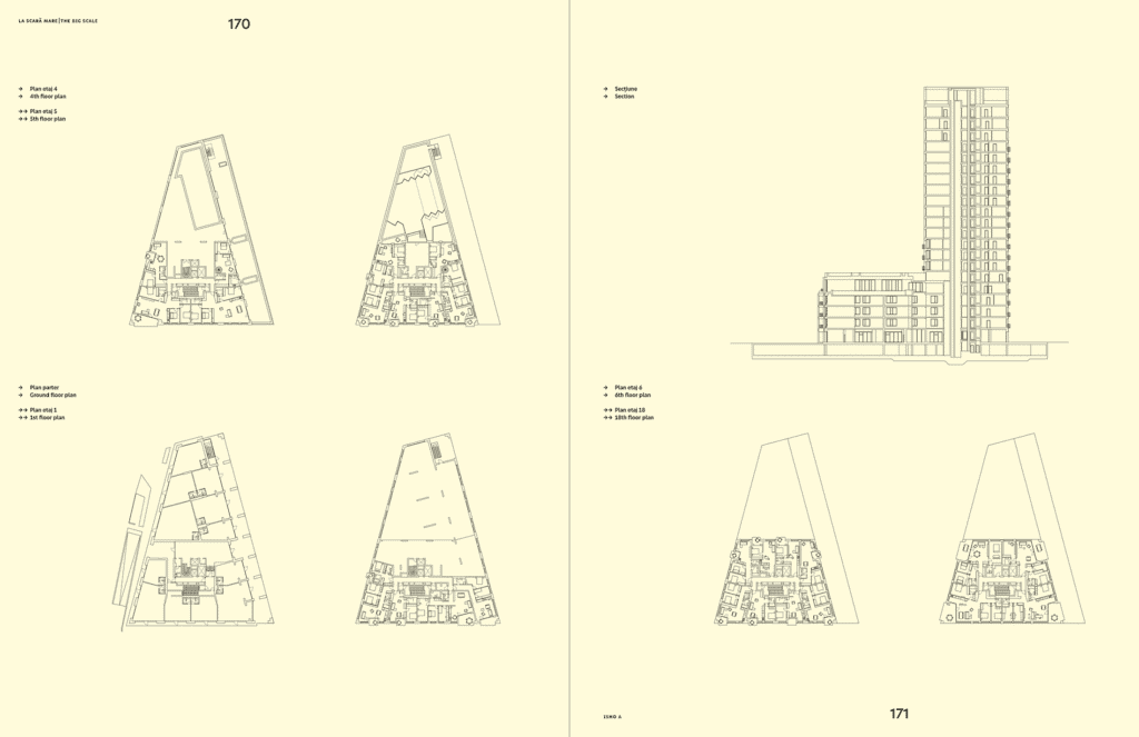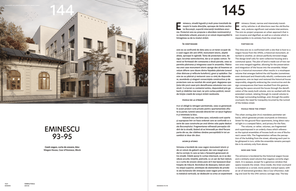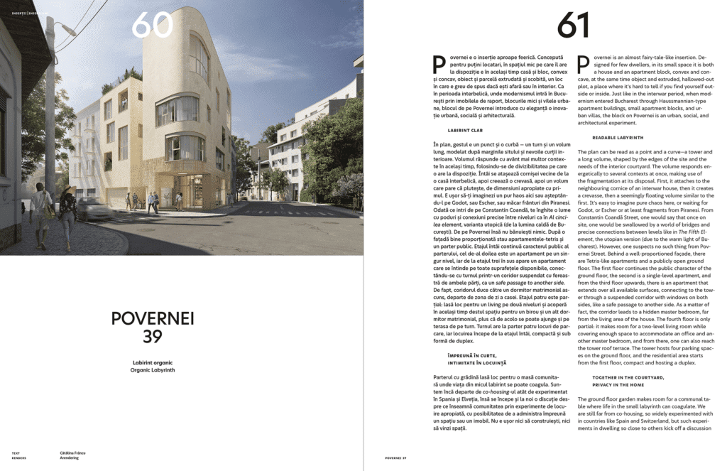 Subtitlul acestei cărți exprimă faptul că nu ne concentrăm pe câteva exemple, ci prezentăm, cu ponderi foarte diferite, 31 de lucrări. Proiectele din carte sunt împărțite în 4 categorii, în funcţie de dimensiuni, dar și de locul în care sunt așezate, de rolul urban și de caracterul arhitectural. Avem astfel inserții – clădiri de dimensiuni mai mici care ocupă spații libere într-un țesut central constituit –, apoi fragmente de țesut – ansambluri care nu se inserează, ci mai degrabă articulează părți de oraș existent, propun o densificare civilizată și complexă. La scară mare este un titlu ce nu mai are, credem, nevoie de explicații. Categoria Reflexie și experiment nu mai ține în niciun fel de scară, ci de căutările despre care vorbeam mai devreme.