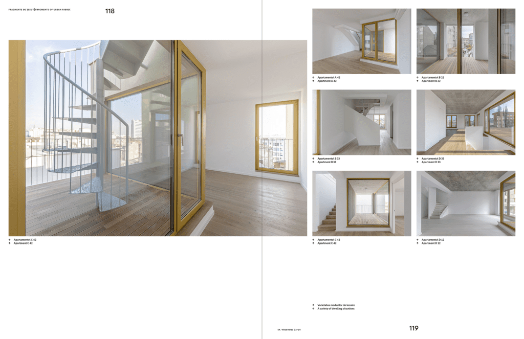 Cele 31 de proiecte și cele 320 de pagini ne duc din București în Germania, din alte orașe mari românești la țară, de la turnuri la expoziții, de la bloculețe cu grădini la o casă experimentală.